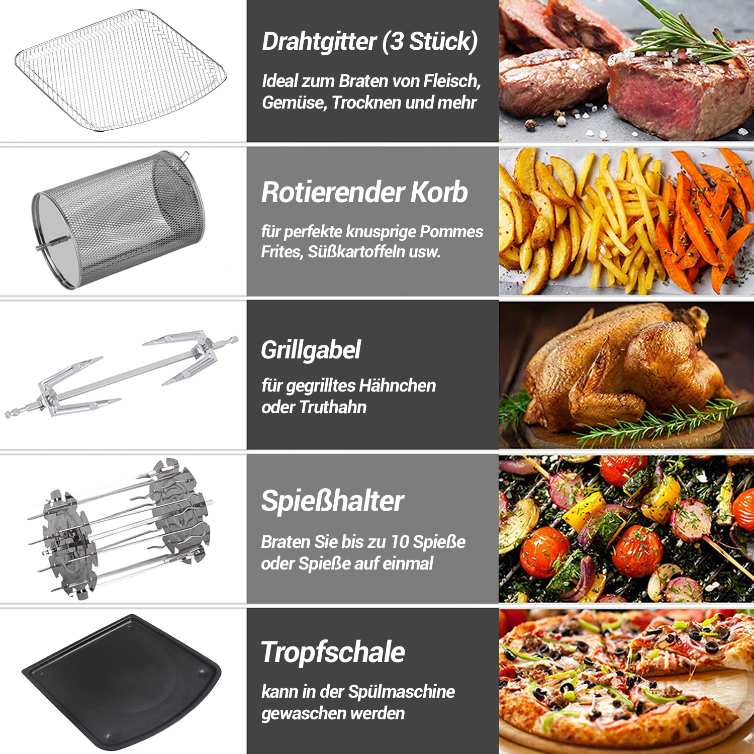 • Heißluftfritteuse, Drehgrill, Backofen, Obsttrockner und mehr
