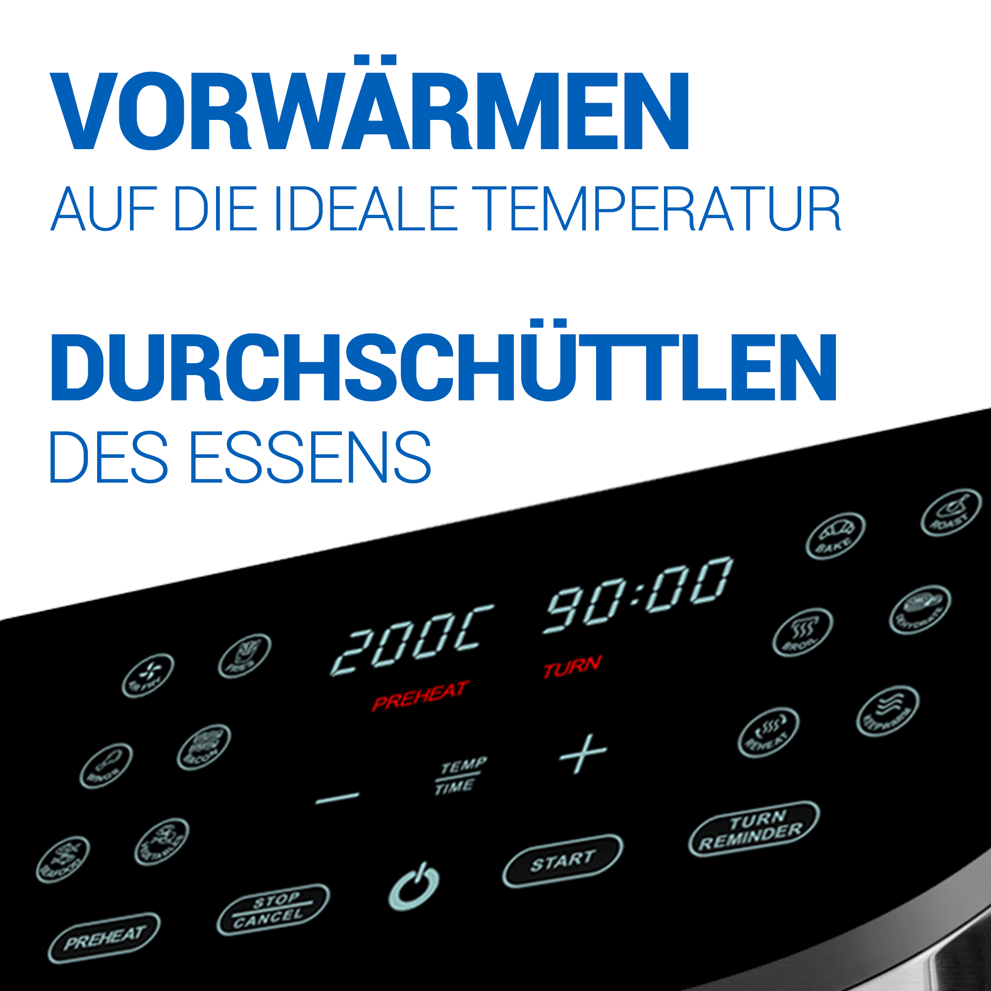 Auf dem zum leichteren Ablesen ergonomisch zu Ihnen gedrehten Digitaldisplay, können Sie die gewünschte Garzeit und Gartemperatur manuell einstellen oder aus voreingestellten Programmen wie Pommes, Backen, Meeresfrüchte oder Dörren wählen.