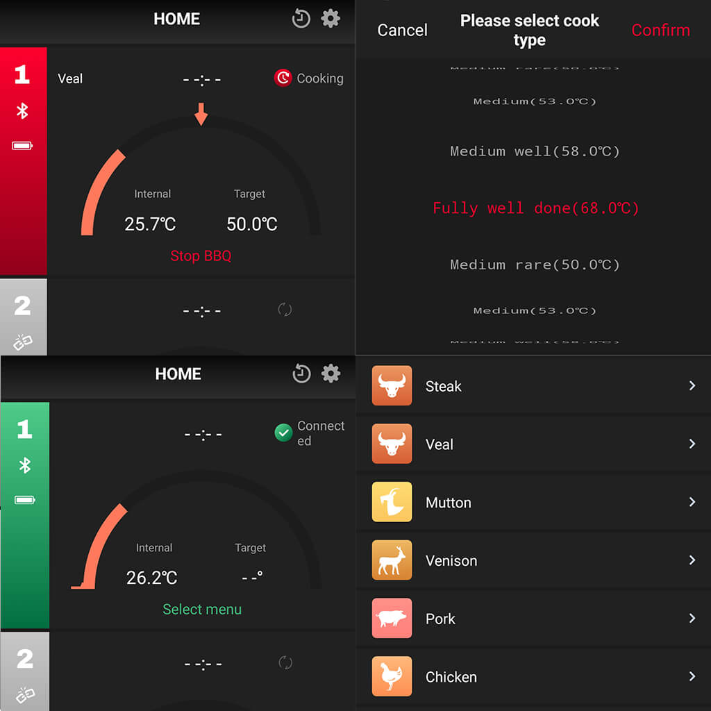 Sie können eine Anwendung für Android-/iOS-Systeme herunterladen, die ein perfektes Arbeiten mit dem Temperaturfühler ermöglicht. Die Verbindung wird über die Bluetooth-Technologie sichergestellt. Wählen Sie die Fleischsorte, den Gargrad oder legen Sie Ihre eigenen Vorlieben fest. Die App benachrichtigt Sie, wenn das Fleisch so fertig ist, wie Sie es mögen.