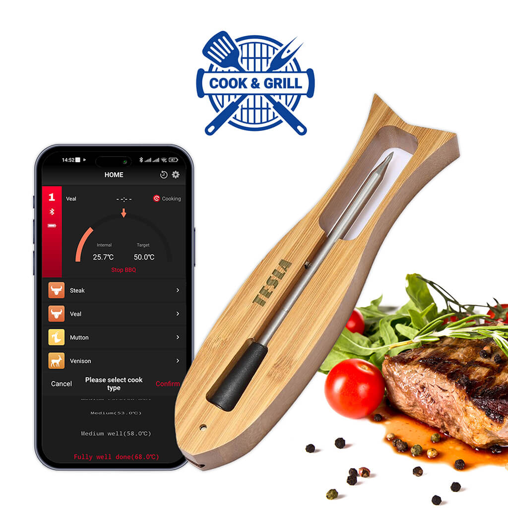 Einfach den TESLA Cook BBQ100 in das Fleisch injizieren und die gewünschten Parameter in der App einstellen, Sie werden benachrichtigt, wenn das Fleisch fertig ist. Zusätzlich zu den manuellen Werten können Sie aus mehreren voreingestellten Programmen für verschiedene Fleischsorten und deren Gargrad wählen. Und mit einer Reichweite von bis zu 50 Metern können Sie sich von den Speisen, die Sie zubereiten, entfernen.