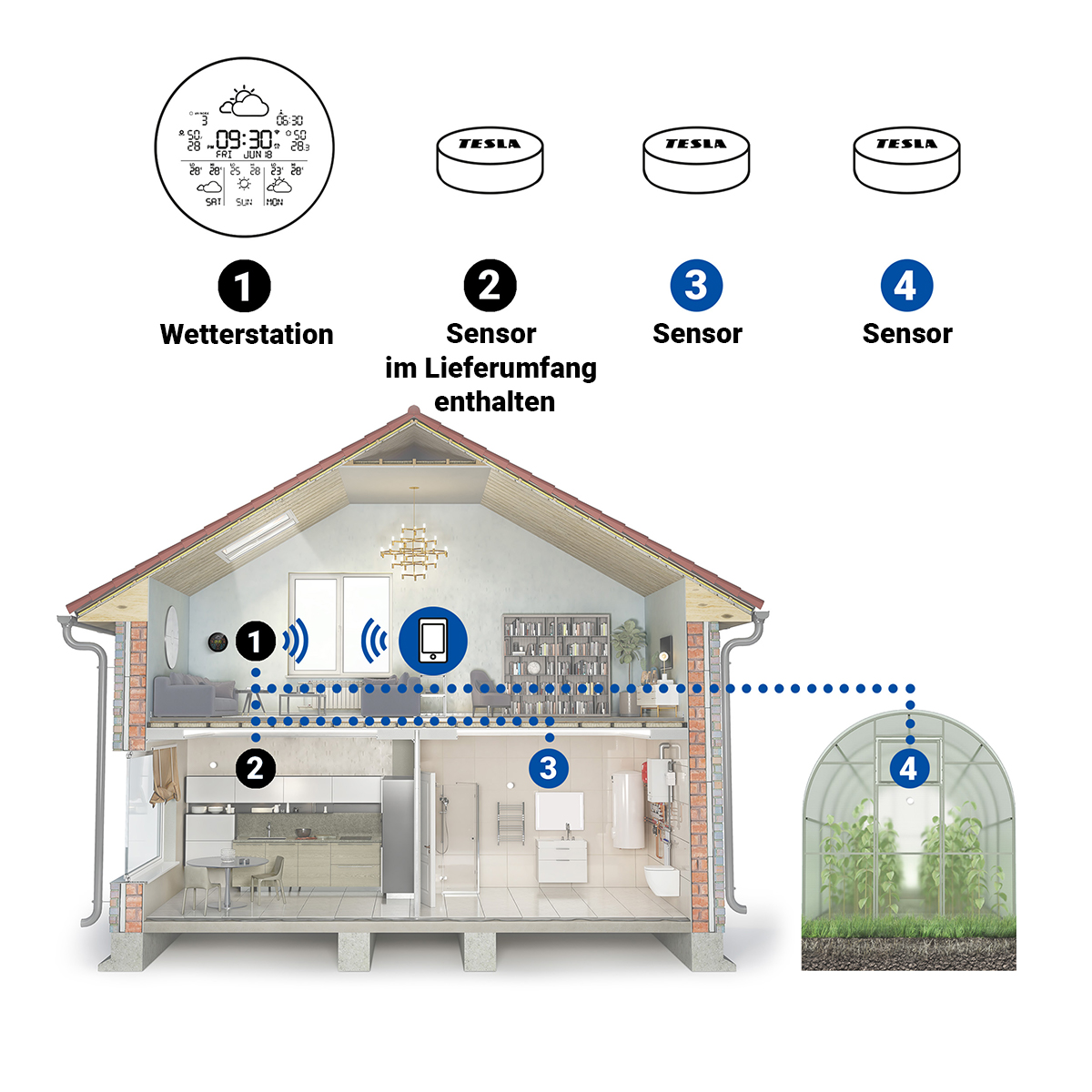 Mit der intelligenten Wetterstation TESLA Device MS360 werden Sie vom Wetter nie wieder überrascht. Dank externem Sensor und WiFi-Verbindung haben Sie stets aktuelle Informationen zu Temperatur und Luftfeuchtigkeit sowohl im Innenbereich Ihres Zuhauses als auch im Außenbereich. Die Hauptstation zeigt das aktuelle Wetter an ihrem Standort sowie detaillierte Informationen über das Raumklima an. Die von den externen Sensoren gemessenen Daten können Sie in einer übersichtlichen mobilen App einsehen, die das Überwachen von bis zu drei Sensoren an verschiedenen Standorten ermöglicht. Zudem erhalten Sie eine Drei-Tage-Wettervorhersage mit Grafiken, eine aktuelle stündliche Vorhersage sowie detaillierte Informationen zu Sonnenauf- und -untergang und zum UV-Index. Die Station TESLA Device MS360 ist der ideale Helfer für alle, die jederzeit und überall einen perfekten Überblick über das Wetter haben möchten. Dank einfacher Installation und intuitiver Bedienung kann sie jeder nutzen.