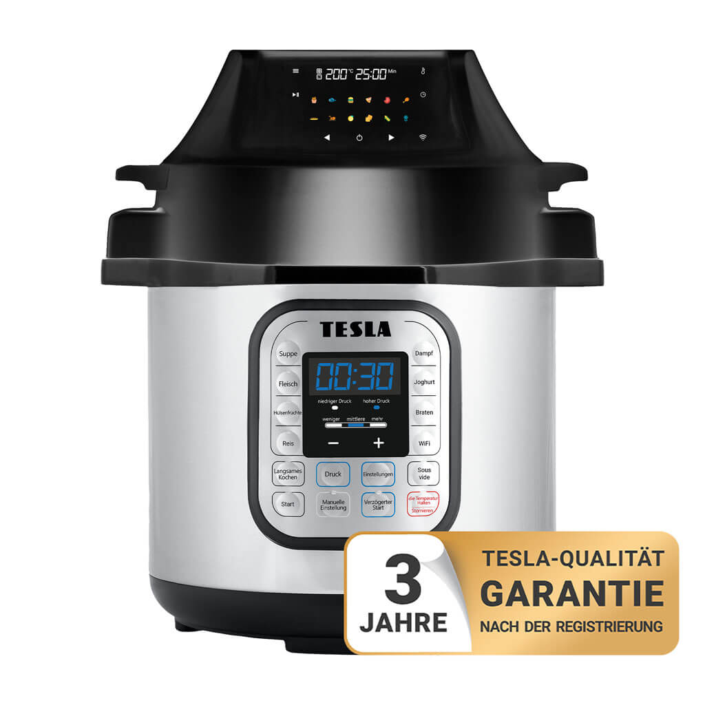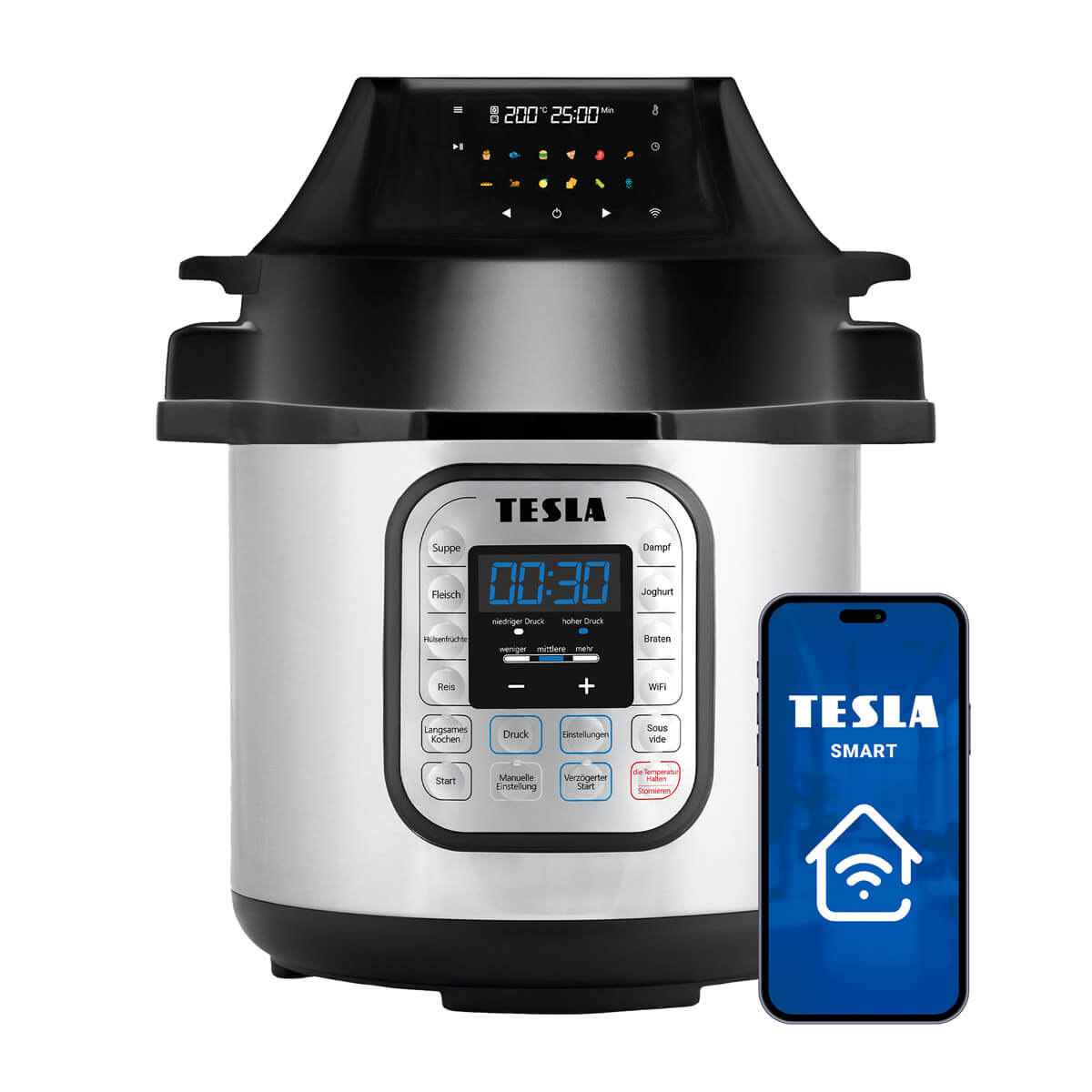 Das Multifunktionsgerät TESLA EliteCook K70 WiFi Duo ist Schnellkochtopf, Heißluftfritteuse, Sous Vide, Schongarer, Reiskocher, Joghurtbereiter, Eierkocher, Speisenwärmer, Dörrgerät, Sterilisator, Dampfgarer, Brat- oder Sautierpfanne. Sie können unter Druck kochen, Schongaren nutzen, mit der Sous-vide-Methode garen, Ihren eigenen Joghurt herstellen, Dampfgaren und Startverzögerung nutzen oder ähnlich wie in einem klassischen Schnellkochtopf beispielsweise klassische Brühe, Gulasch, Rind-/Schweinebraten, Hähnchen, Chili, Nudeln, Frikadellen, Kohl, Perkelt, Kartoffeln, Reis, Hülsenfrüchte und mehr genießen. Darüber hinaus erhalten Sie auch die Möglichkeit, knuspriges Hähnchen, Pommes, Steak, Fisch zuzubereiten oder Speisen mit Heißluft zu überbacken.