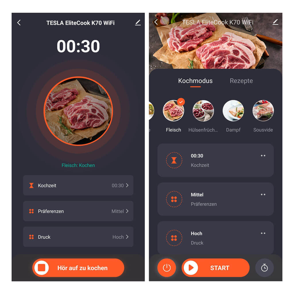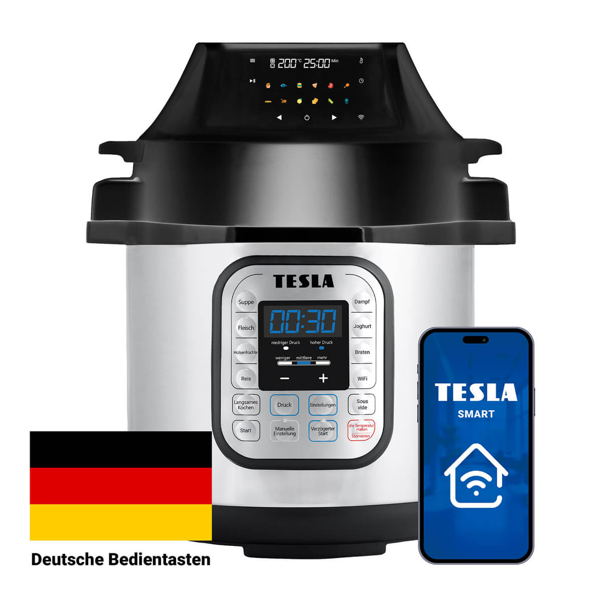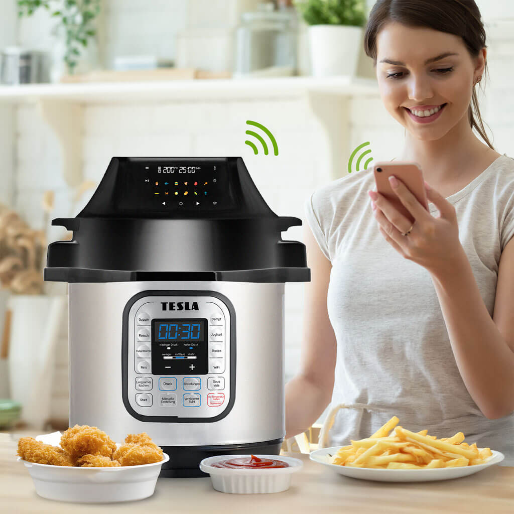 Mit dem TESLA EliteCook K70 WiFi Duo können Sie Ihren Schnellkochtopf und Ihre Heißluftfritteuse mithilfe der TESLA Smart-App steuern. Sie können die verbleibende Garzeit überwachen, eines der gespeicherten Programme ein- und ausschalten, Temperatur und Druck manuell einstellen, das Programm „Verzögerter Start“ starten, die Dauer des Programms „Warmhalten“ anpassen oder sich von einem der vielen Kochrezepte inspirieren lassen.