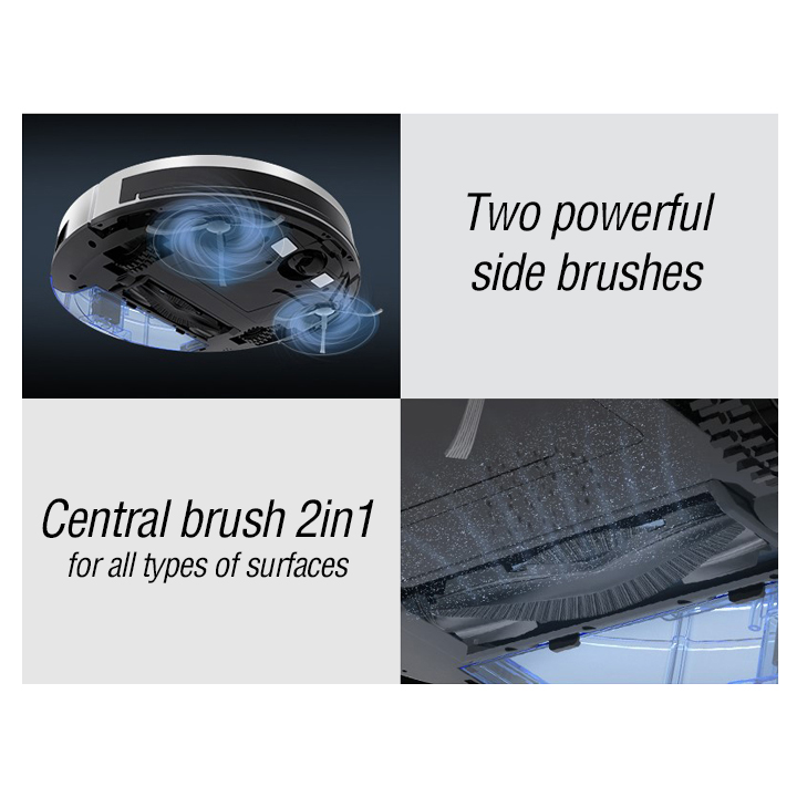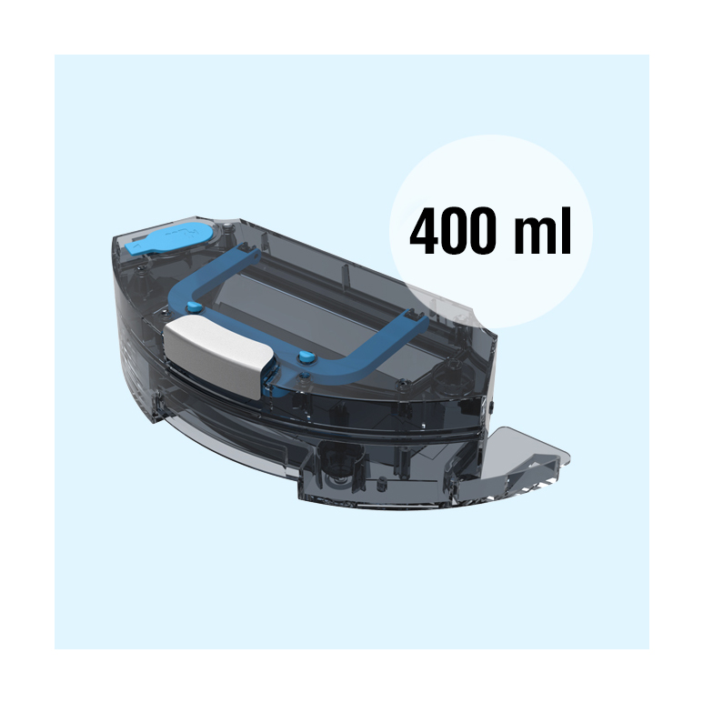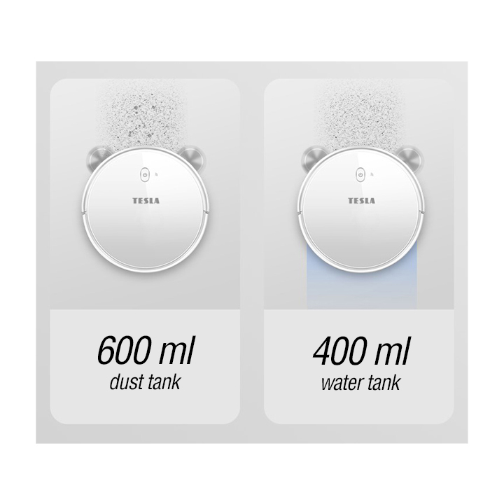 Der TESLA RoboStar iQ300 spart Ihnen Zeit. Er kann saugen und mit einem Nassmopp wischen. Er wischt den Boden mit einem feuchten Mikrofasermopp, der den Boden sauber und frei von Mikrostaub und anderem Schmutz hinterlässt. Der 600 ml fassende Schmutzbehälter fasst eine große Menge an Schmutz und muss daher nicht so oft geleert werden. Ein zweiter Wassertank mit einem Fassungsvermögen von 400 ml ermöglicht es, den Boden mit Wasser zu wischen.