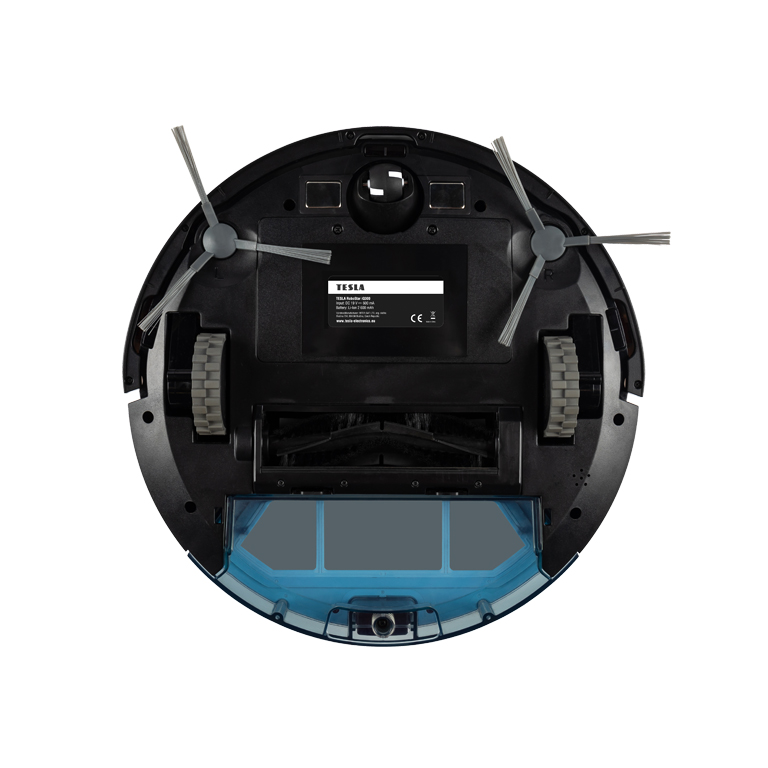 Ein Paar antistatischer Seitenbürsten mit Borsten fegt den Schmutz in die Reinigungsbahn der spiralförmigen 2in1-Turbo-Kombibürste, die den Schmutz sowohl auf Böden als auch auf Teppichen mühelos beseitigt. Der TESLA RoboStar iQ300 reinigt auch um Möbel herum, an Wänden entlang, in Raumecken und anderen schwer zugänglichen Bereichen.