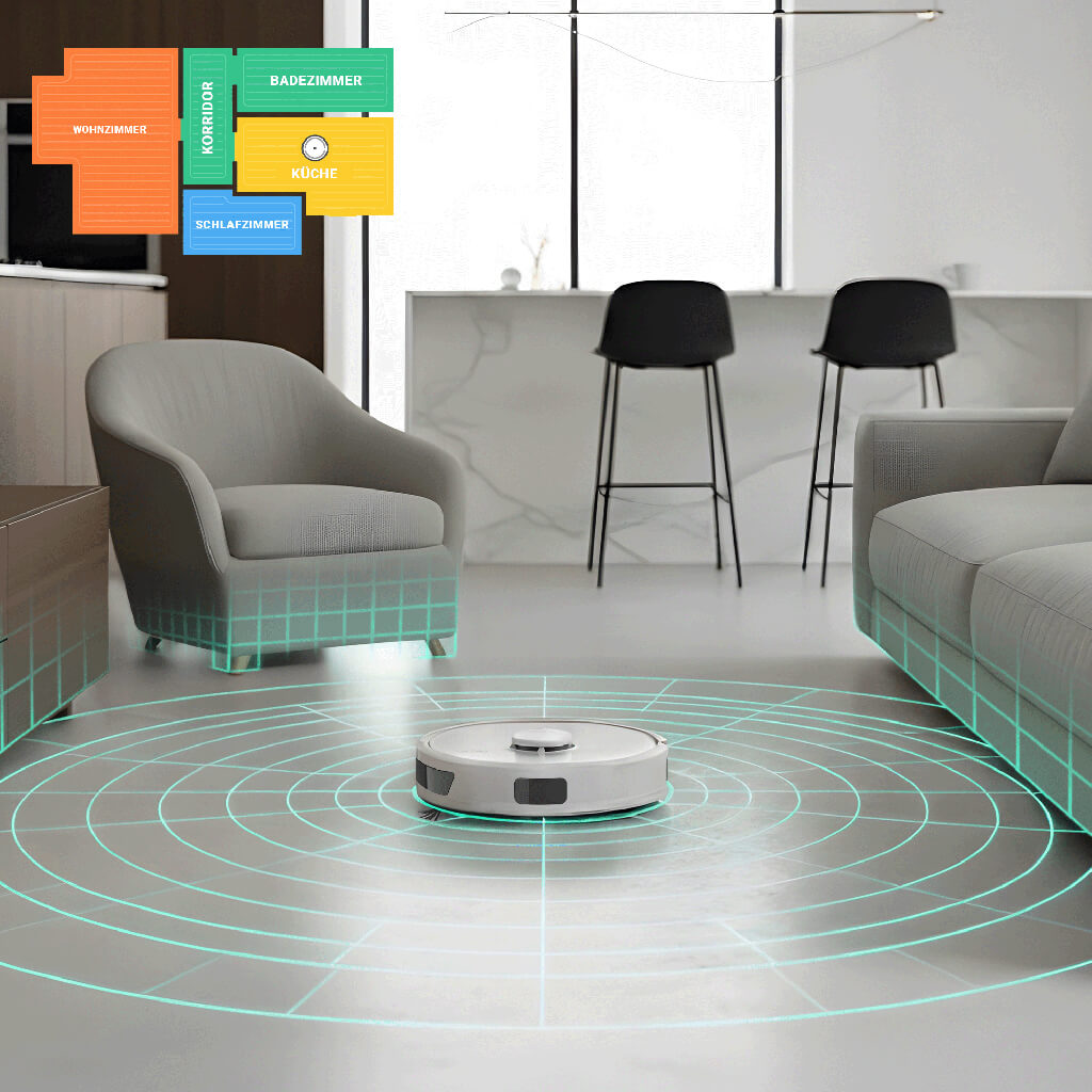 Nach jeder Reinigung erstellt der Saugroboter eine Karte, die Sie speichern können. In diesen Karten können Sie „Verbotene Zonen“ oder „Virtuelle Wände“ für Bereiche erstellen, in denen der Saugroboter nicht reinigen oder mit Wasser wischen soll. Er unterstützt die mehrstöckige Kartierung und speichert bis zu 5 Karten. Damit ist er die ideale Lösung für mehrstöckige Häuser. Der Saugroboter passt sich perfekt an alle Ihre Reinigungsanforderungen an. Natürlich können Sie ihn auch an einen bestimmten Ort auf der Karte schicken.