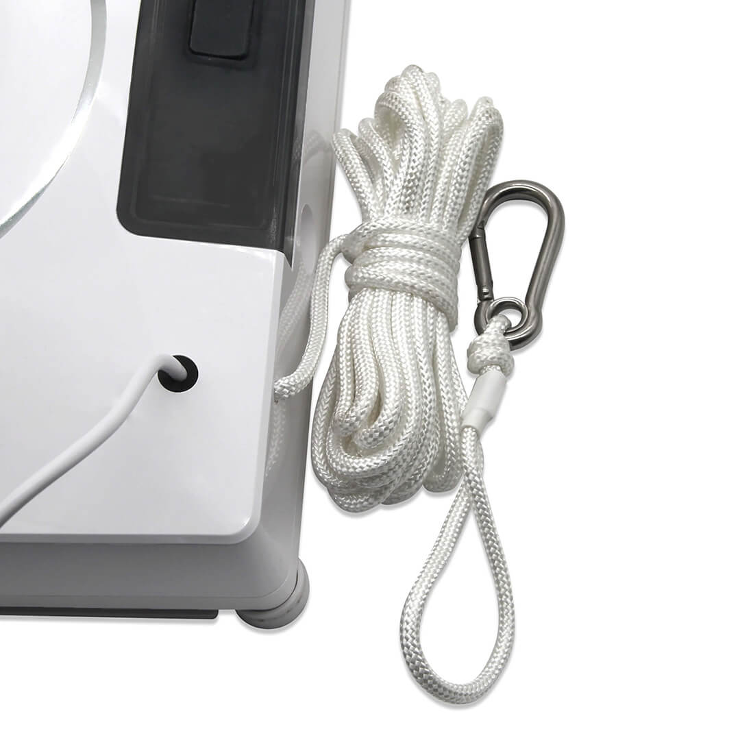 Der Reinigungsroboter wird über ein Netzkabel an eine Steckdose angeschlossen. Bei einem Stromausfall wird der eingebaute Backup-Akku aktiviert und die Sicherheit durch ein langlebiges Sicherheitskabel mit Karabiner ergänzt.