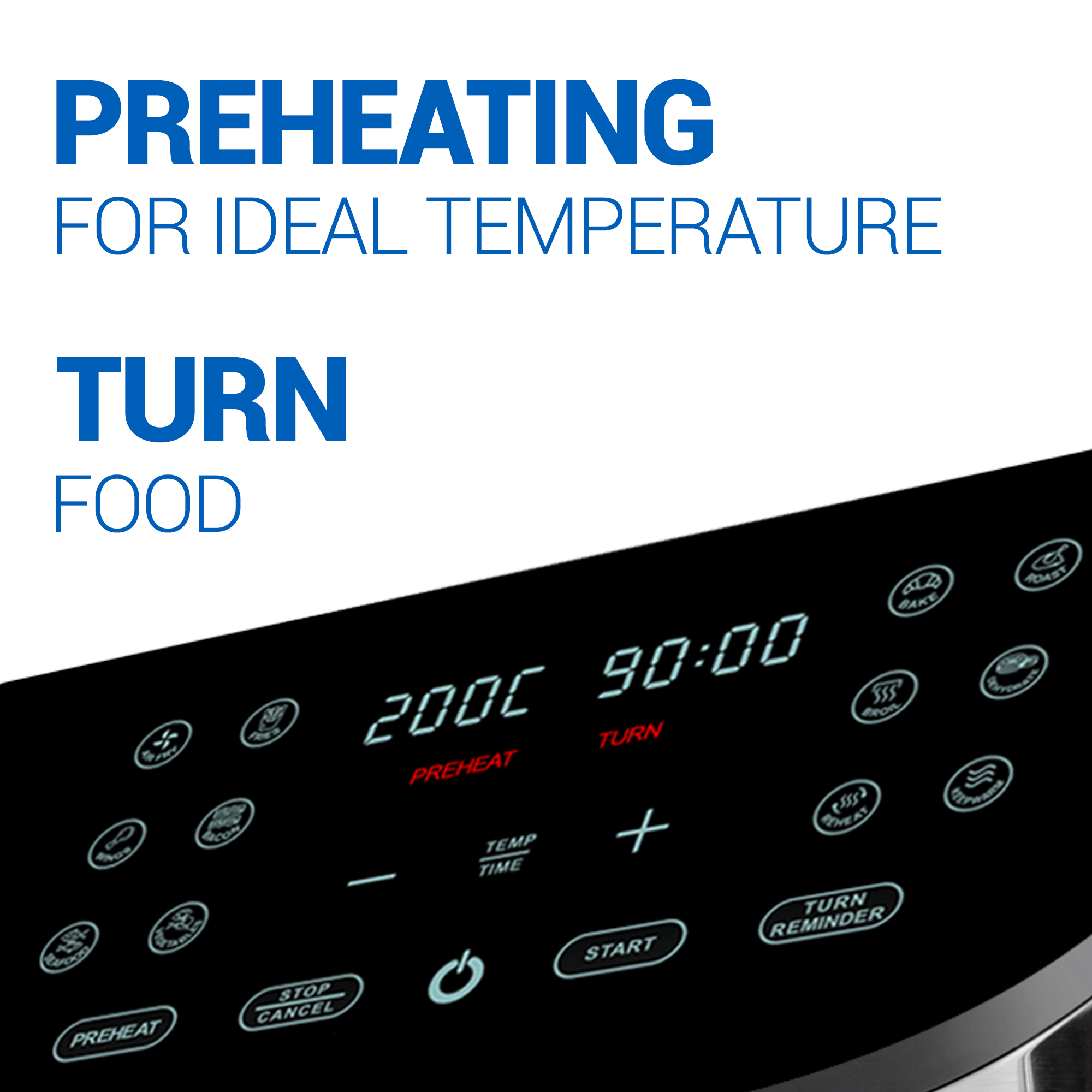 Quick program presets Hot Air, French Fries, Wings, Bacon, Seafood/Fish, Vegetables, Bake, Roast, Grill and Dehydrate. Comfort is complemented by the Reheat and Keep warm functions.
