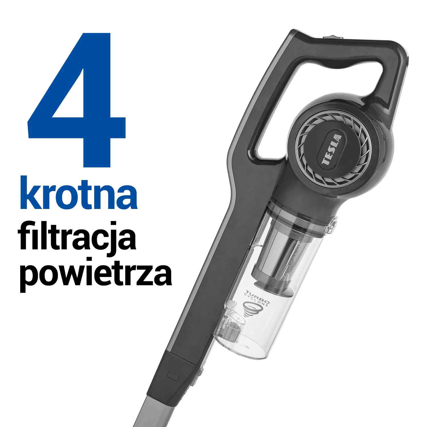 Odkurzacz wyposażony jest w najnowocześniejszy system poczwórnej filtracji powietrza. Technologia filtracji cyklonowej zapewnia dużą siłę ssania, która nieustannie obraca powietrze wewnątrz odkurzacza, oddzielając w ten sposób powietrze od zanieczyszczeń. Następnie powietrze jest najpierw filtrowane za pomocą drobnego filtra głównego ze stali nierdzewnej, potem wtórnego filtra piankowego, a na koniec oczyszczane za pomocą wydajnego filtra EPA.