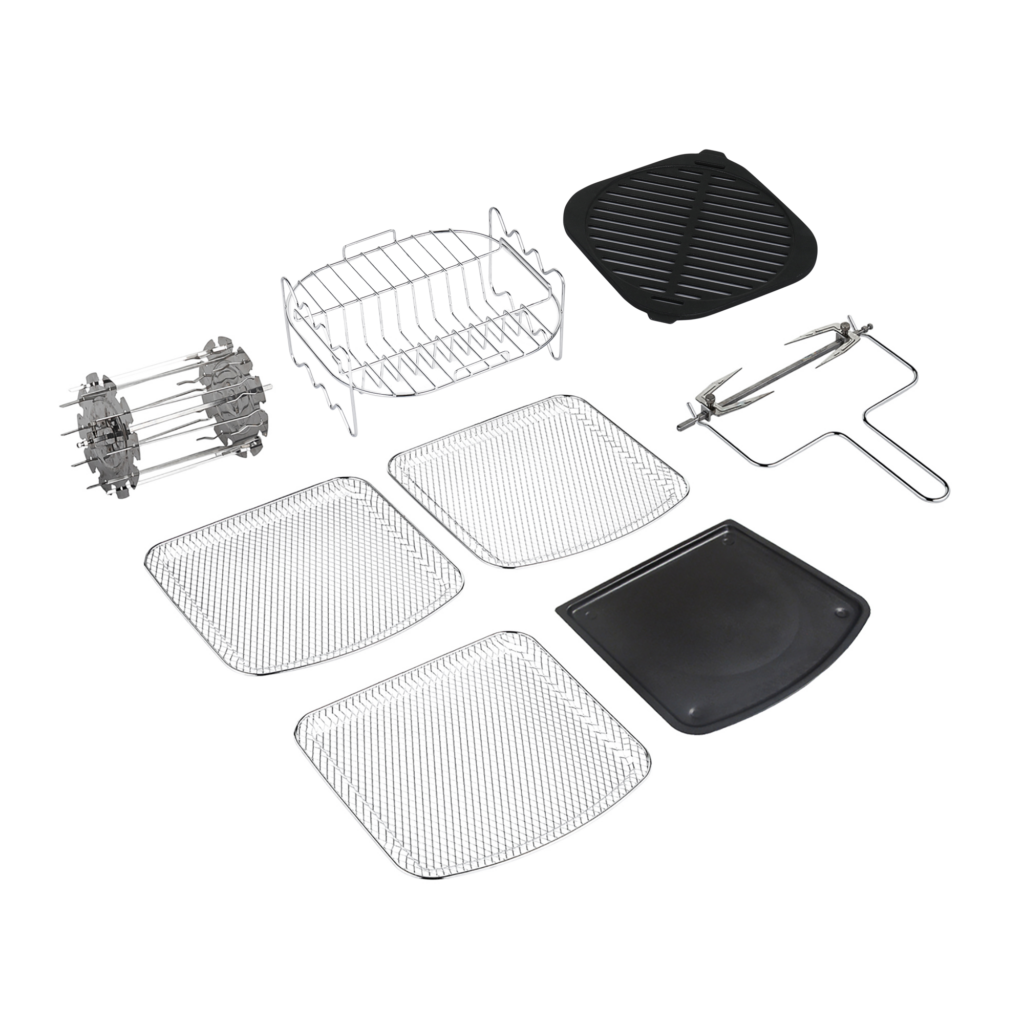 TESLA AirCook & Grill QG600 jest wyposażony w bogate akcesoria, które zapewniają szeroki zakres zastosowań podczas gotowania – wielofunkcyjny uchwyt z płytą grillową, 10 uchwytów na szaszłyki lub rożen, 3 druciane stojaki, tacę ociekową, widelec do grillowania, wyjmowany uchwyt i kolorową książkę kucharską z przepisami.