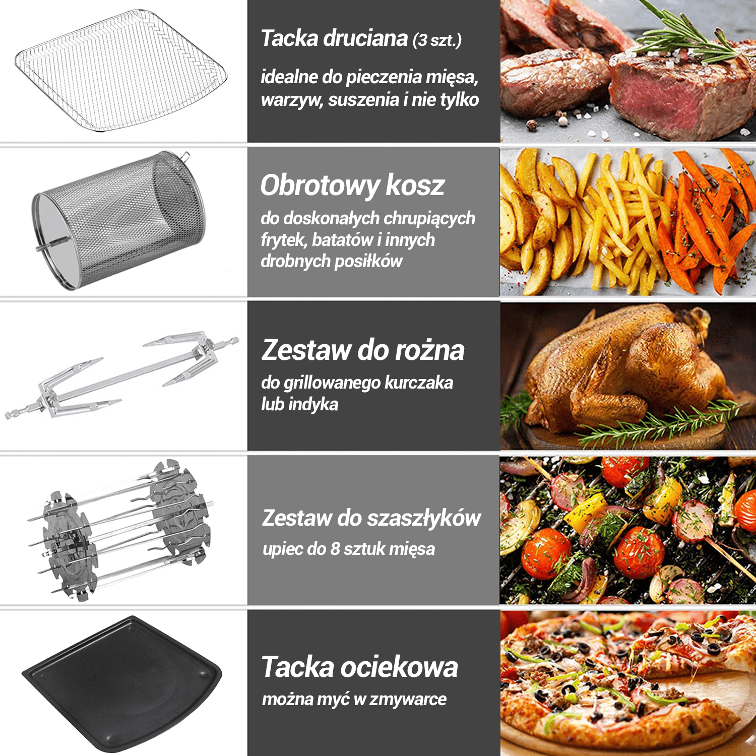 Przygotuj pysznego grillowanego kurczaka, doskonałą pizzę, stek, pyszne szaszłyki i wiele innych potraw z cyfrowym piekarnikiem i frytownicą tak, jak lubisz – chrupiące na zewnątrz i miękkie w środku.