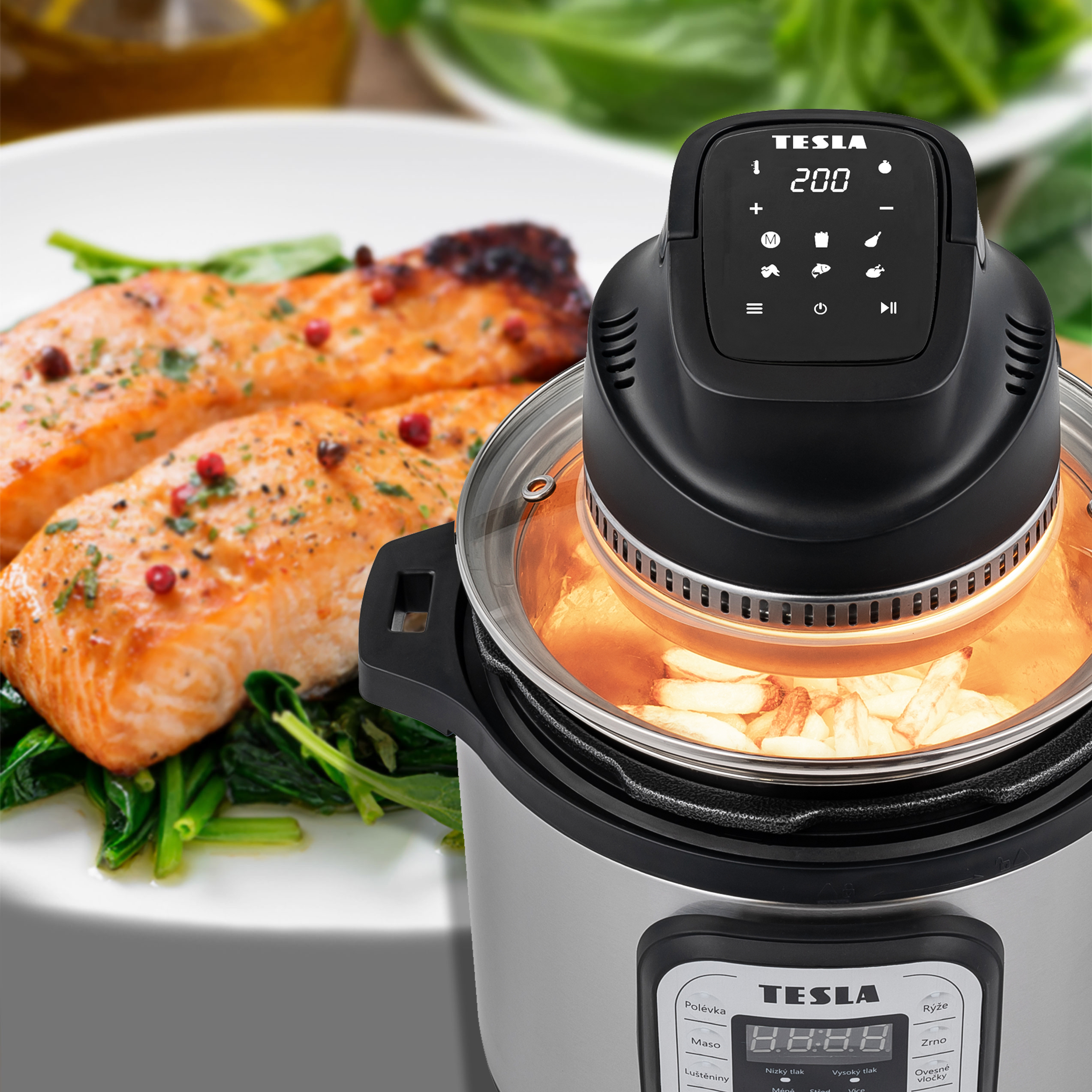 Wielofunkcyjna pokrywa TESLA AirCook Q10 do podgrzewania gorącym powietrzem jest idealnym dodatkiem do elektrycznego szybkowaru TESLA EliteCook K70, ale także do elektrycznych szybkowarów innych marek lub klasyczne garnki kuchenne o średnicy naczynia 22 cm lub 24 cm.