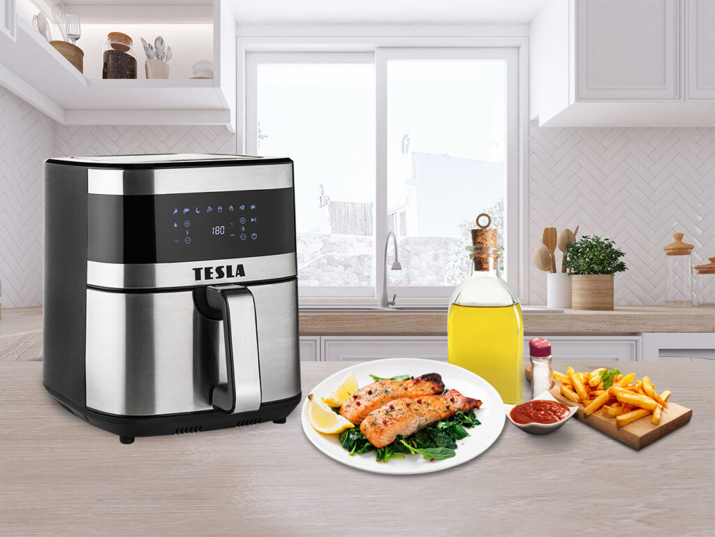 Czy lubisz smażone potrawy, ale boisz się, że są niezdrowe? Dzięki frytkownicy na gorące powietrze TESLA nie musisz już mieć do czynienia ze szkodliwymi spalonymi olejami lub żywnością nasączoną tłuszczem. Rezultatem są frytki, kurczak lub stek przygotowane tak, jak lubisz – chrupiące na zewnątrz i miękkie w środku.