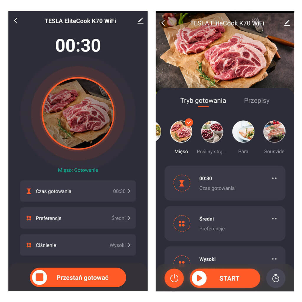 TESLA EliteCook K70 WiFi za pomocą telefonu komórkowego pozwala monitorować pozostały czas gotowania na telefonie komórkowym, włączać i wyłączać dziewięć zaprogramowanych programów, ręcznie ustawiać temperaturę i ciśnienie, uruchamiać program „Opóźniony start”, regulować czas trwania programu „Utrzymanie temperatury” lub zainspiruj się jednym z wielu przepisów z procedurą przygotowania.