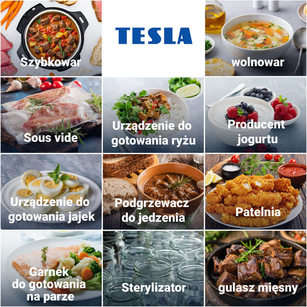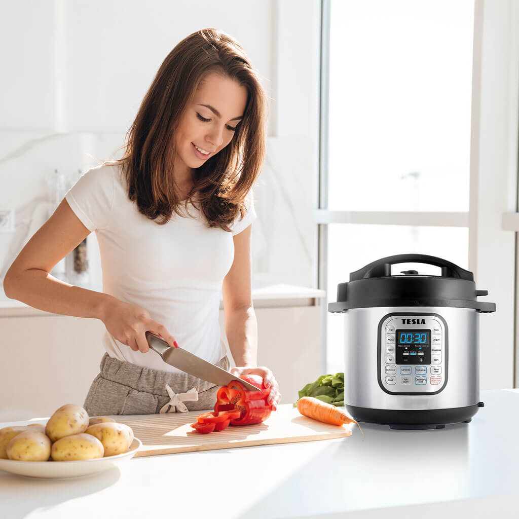 Wielofunkcyjny elektryczny szybkowar TESLA EliteCook K70 WiFi to urządzenie 11 w 1: szybkowar, wolnowar, ryżowar, Sous vide (program z zakresem temperatur 50-58 °C), jogurtownica, jajowar, parowar, podgrzewacz potraw, patelnia, sterylizator, garnek do gulaszu. Można gotować pod ciśnieniem, można użyć powolnego gotowania, gotować metodą Sous vide, samodzielnie przyrządzać jogurt, korzystać z gotowania na parze i opóźnionego startu lub delektować się np. klasycznym bulionem, gulaszem, pieczenią wołową/wieprzową, kurczakiem, chili, makaronem, klopsikami, kapustą, parmezanem, ziemniakami, ryżem, roślinami strączkowymi i nie tylko – tak jak w klasycznym szybkowarze.