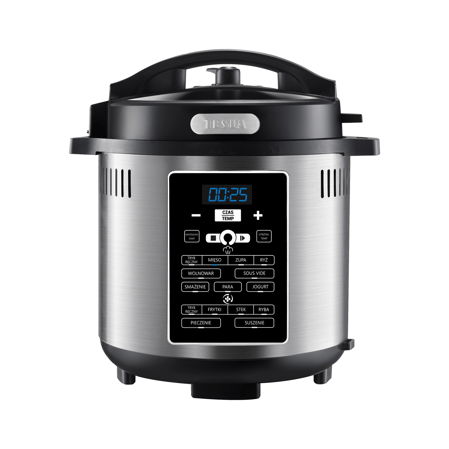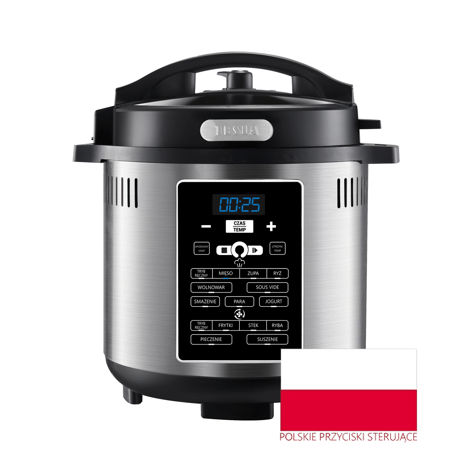 Wyświetlacz cyfrowy z przyciskami w języku polskim ułatwia szybkie ustawienie programu gotowania. Wybrany program automatycznie utrzymuje odpowiednią temperaturę podczas gotowania, reguluje ciśnienie i wyświetlacz pokazuje pozostały czas gotowania. Po programie potrawa jest utrzymywana w cieple, nadająca się do podania na stole.