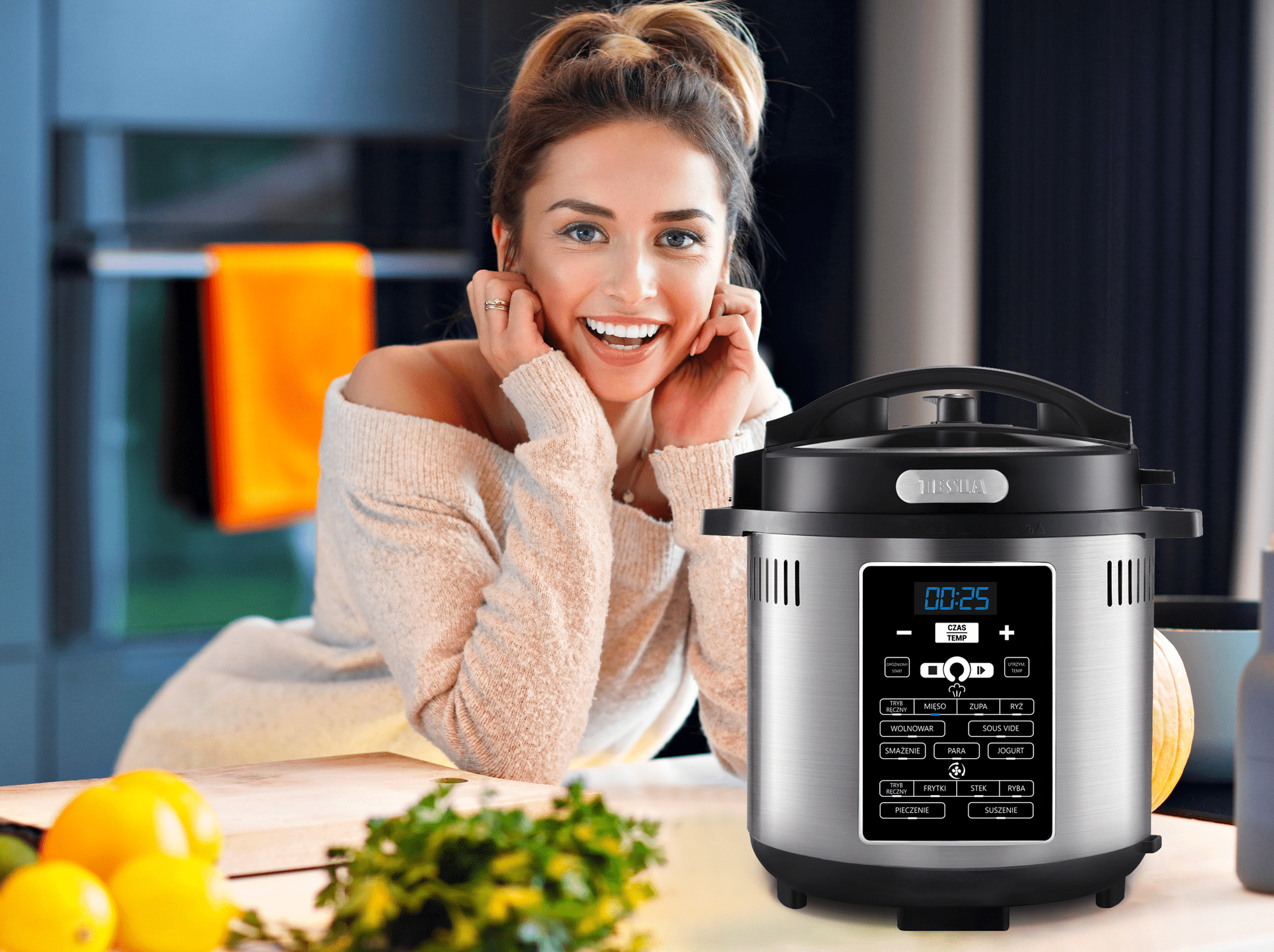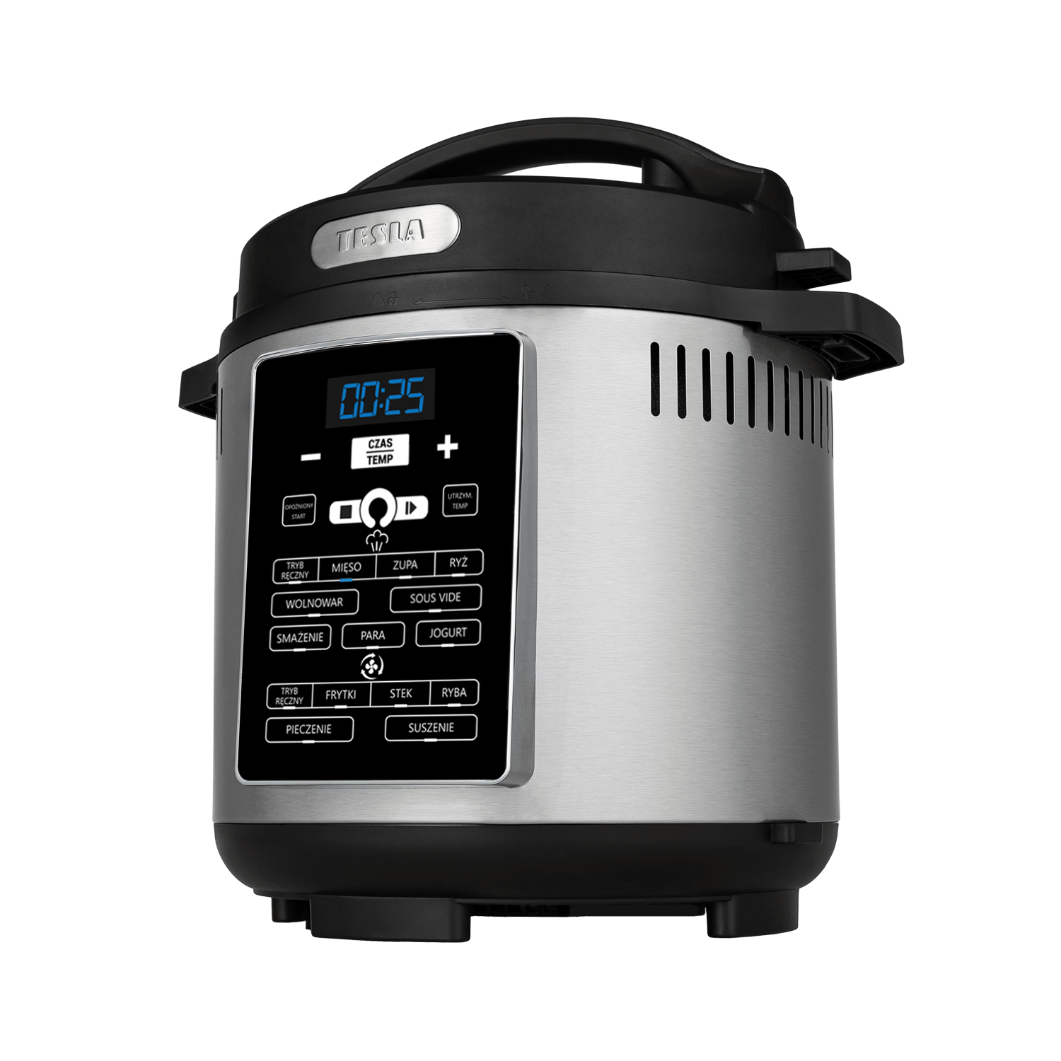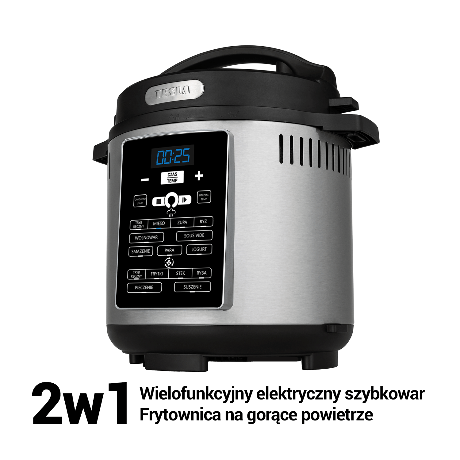 Wielofunkcyjny elektryczny szybkowar TESLA EliteCook K80 Deluxe to szybkowar, frytownica na gorące powietrze, wolnowar, Sous vide, ryżowar, jogurtownica, parowar, patelnia, jajkowar, podgrzewacz do żywności, suszarka do żywności, sterylizator. Jednocześnie ugotują również danie główne i przystawkę. Możesz cieszyć się klasycznym bulionem, gulaszem, pieczeń wołowo-wieprzową, makaronem, klopsikami, kapustą, perkelt, ziemniakami, ryżem, roślinami strączkowymi i nie tylko, podobnie jak w klasycznym szybkowarze. Dodatkowo masz również możliwość upieczenia chrupiącego kurczaka, frytek, steków czy ryb gorącym powietrzem.