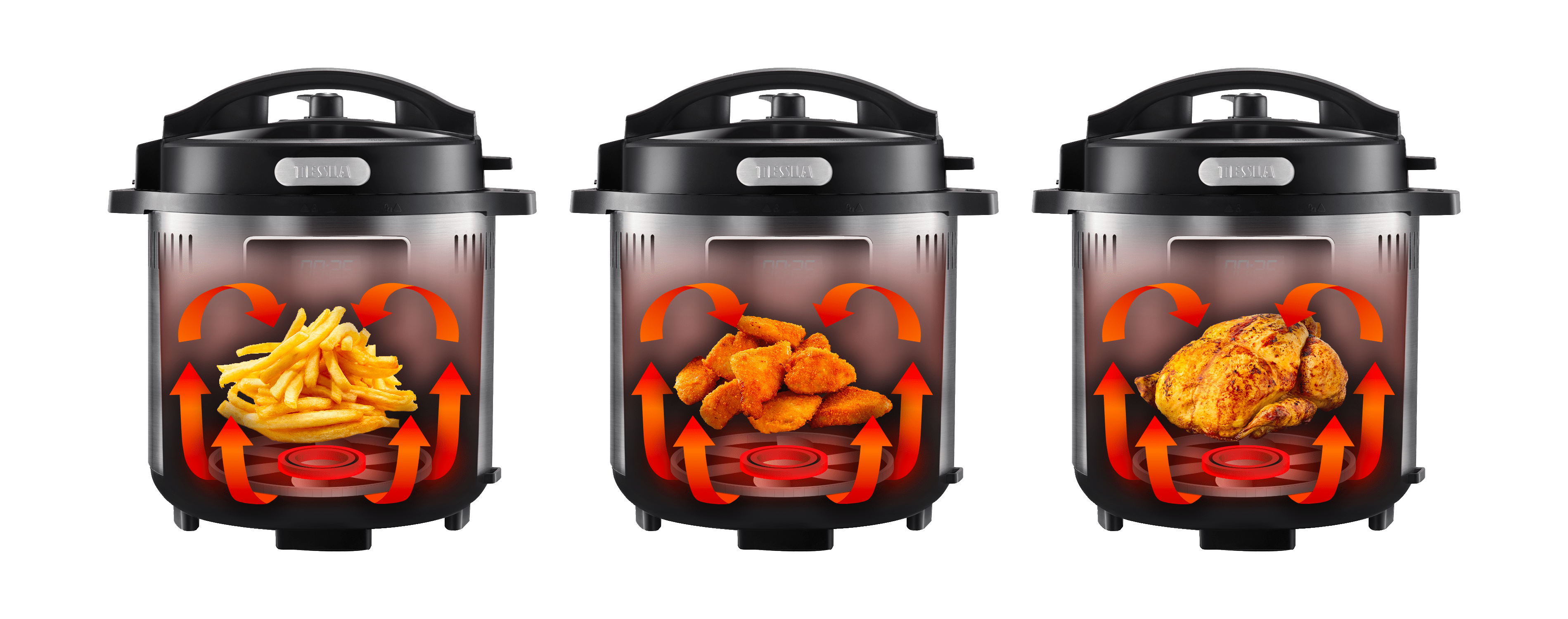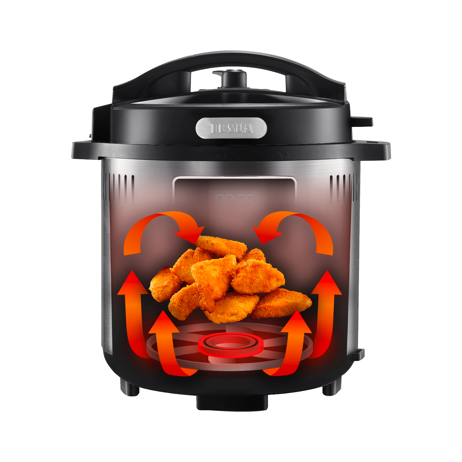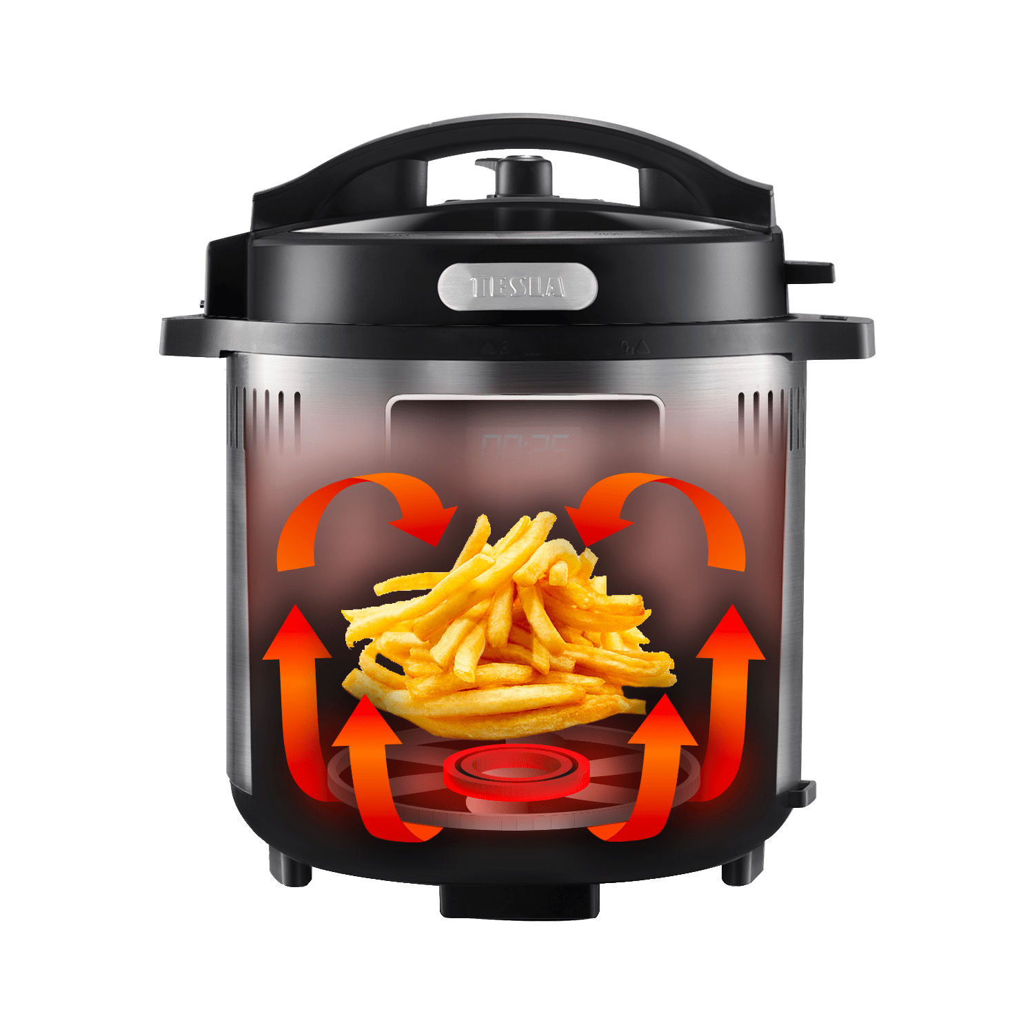Wielofunkcyjny elektryczny szybkowar TESLA EliteCook K80 Deluxe to szybkowar, frytownica na gorące powietrze, wolnowar, Sous vide, ryżowar, jogurtownica, parowar, patelnia, jajkowar, podgrzewacz do żywności, suszarka do żywności, sterylizator. Jednocześnie ugotują również danie główne i przystawkę. Możesz cieszyć się klasycznym bulionem, gulaszem, pieczeń wołowo-wieprzową, makaronem, klopsikami, kapustą, perkelt, ziemniakami, ryżem, roślinami strączkowymi i nie tylko, podobnie jak w klasycznym szybkowarze. Dodatkowo masz również możliwość upieczenia chrupiącego kurczaka, frytek, steków czy ryb gorącym powietrzem.