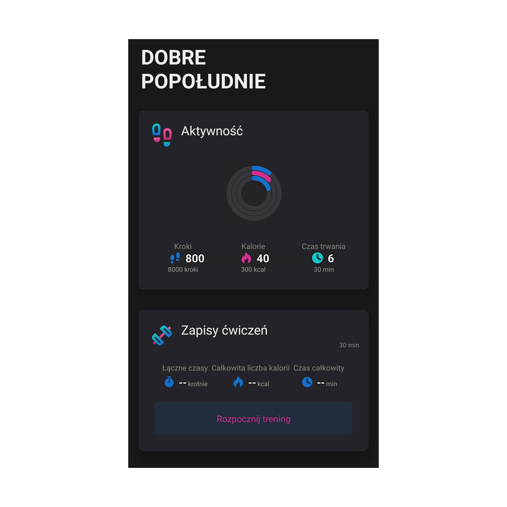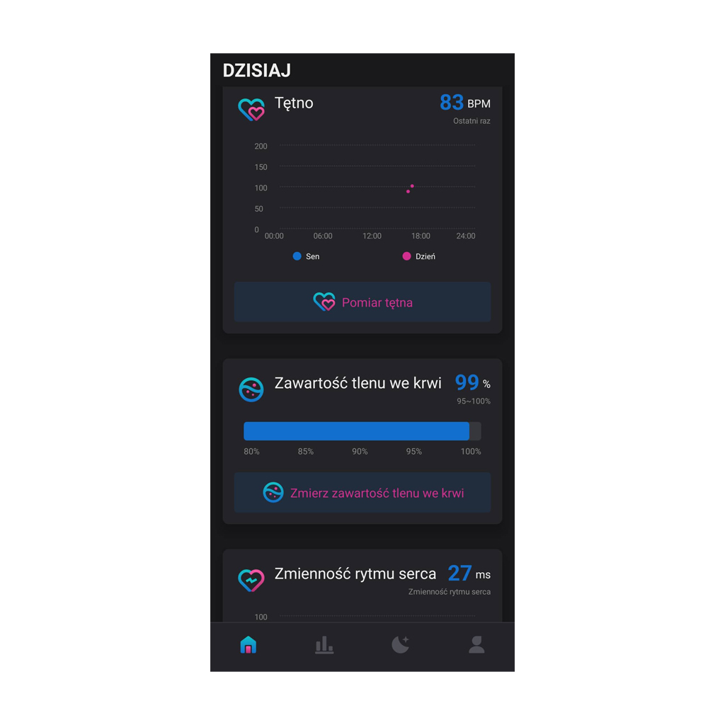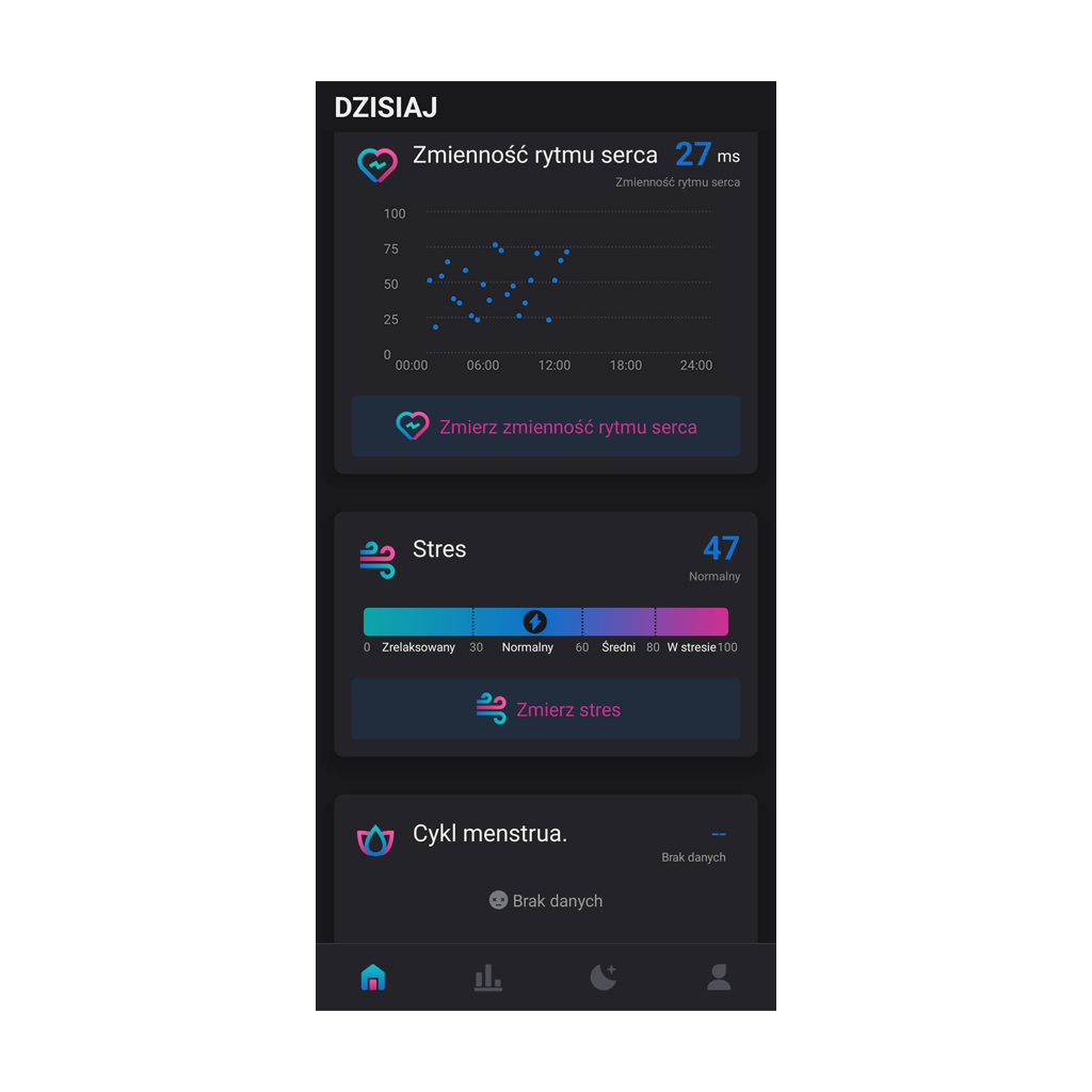 • monitoruje sen, tętno, zawartość tlenu we krwi, zmienność tętna, strefę tętna, stres, aktywność sportową, cykl menstruacyjny