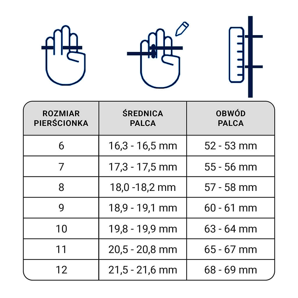 Jeśli zmierzona wartość mieści się pomiędzy dwoma rozmiarami, zalecamy wybór większego rozmiaru pierścionka.