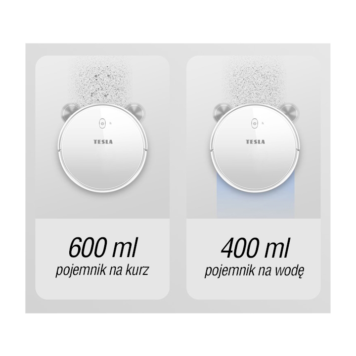 TESLA RoboStar iQ300 to oszczędność czasu. Może odkurzać i mopować na mokro. Do wycierania podłogi wykorzystuje mokry mop z mikrofibry, pozostawiając podłogę czystą i wolną od mikro kurzu i innych zabrudzeń. Zbiornik na zanieczyszczenia o pojemności 600 ml mieści dużą ilość zanieczyszczeń, dlatego nie trzeba go tak często opróżniać. Drugi zbiornik na wodę o pojemności 400 ml pozwala na przetarcie podłogi wodą.