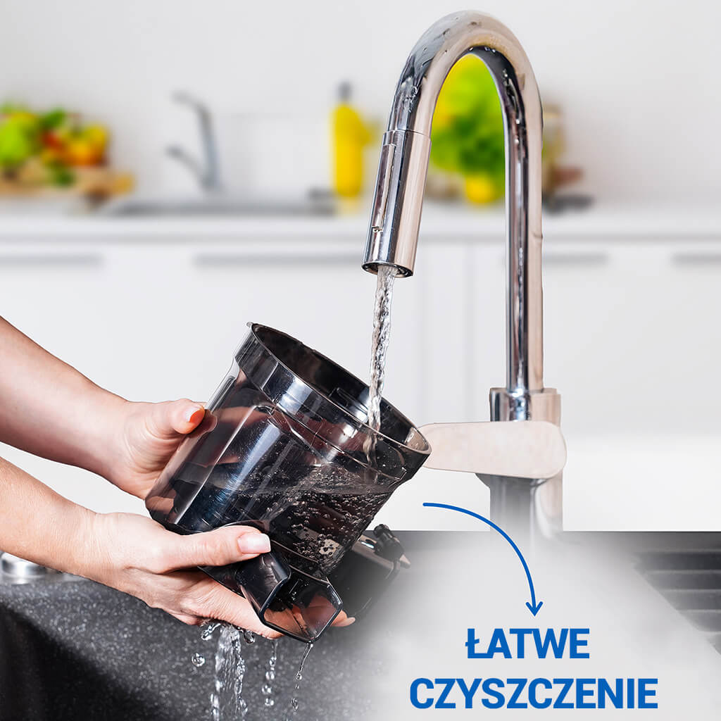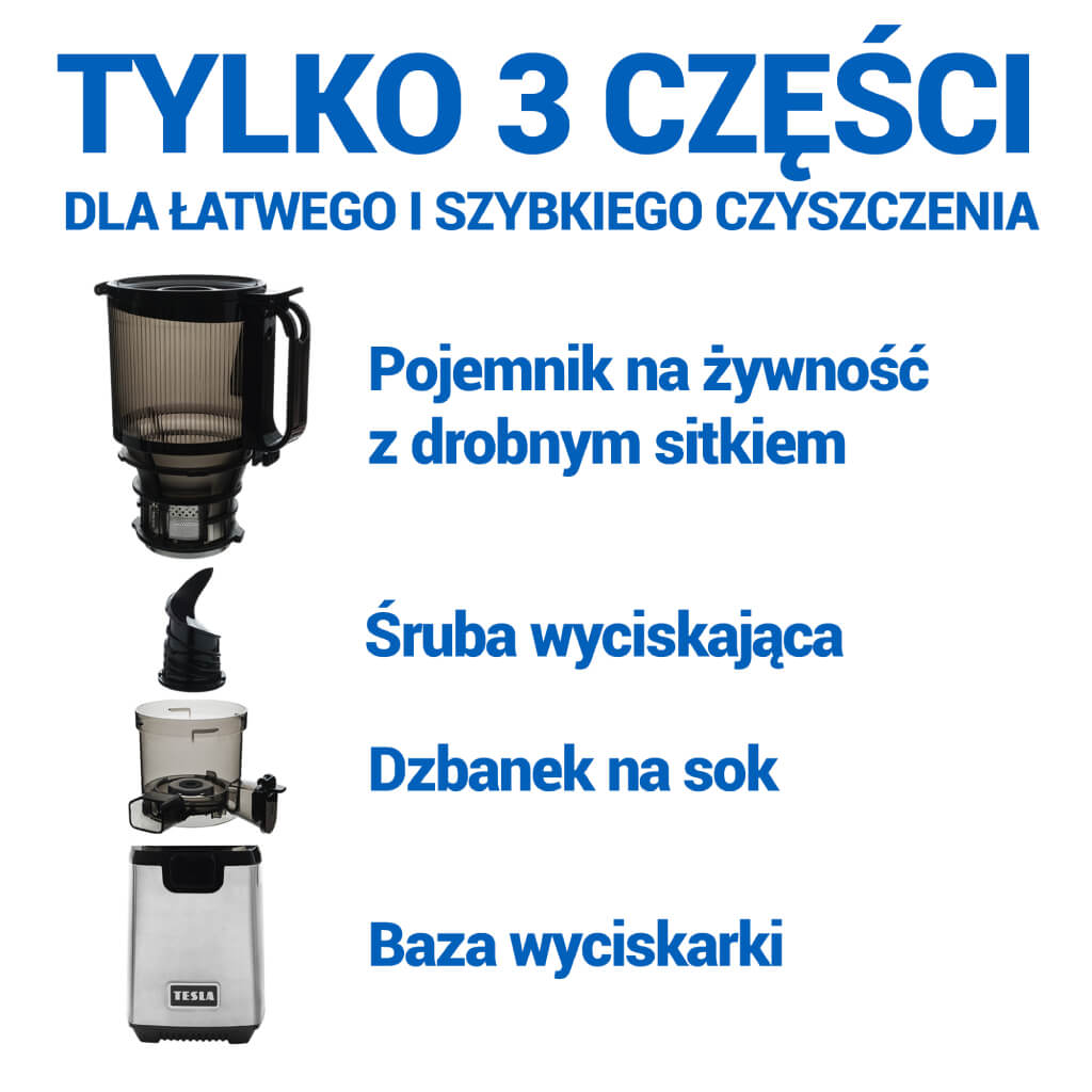 Konstrukcja wyciskarki TESLA SlowJuicer SJ770 XXL Deluxe jest bardzo prosta, składa się tylko z trzech części do złożenia i czyszczenia. Dzięki zintegrowanemu filtrowi dokładnemu możesz w mgnieniu oka wyczyścić zbiornik wraz ze ślimakiem i pojemnikiem na sok. Spędzaj więcej czasu na wyciskaniu soku, a mniej na czyszczeniu.