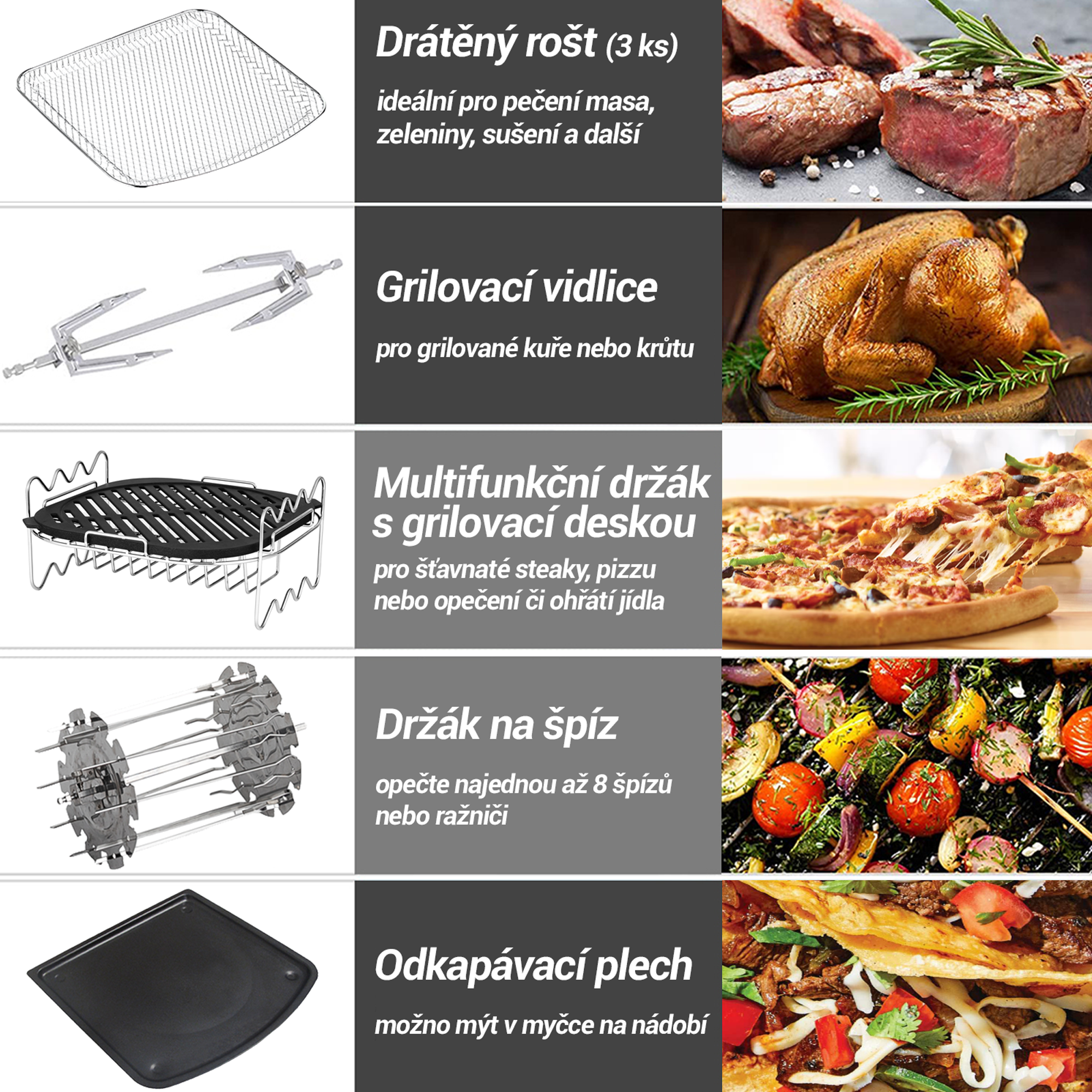 TESLA AirCook & Grill QG600 je dodávána s bohatým příslušenstvím, které přináší široké možností využití pro vaše vaření – multifunkční držák s grilovací deskou, 10 jehlic s držákem pro špíz nebo ražniči, 3 drátěné rošty, odkapávací plech, grilovací vidlice, odnímatelný držák a barevnou tištěnou kuchařkou s recepty.
