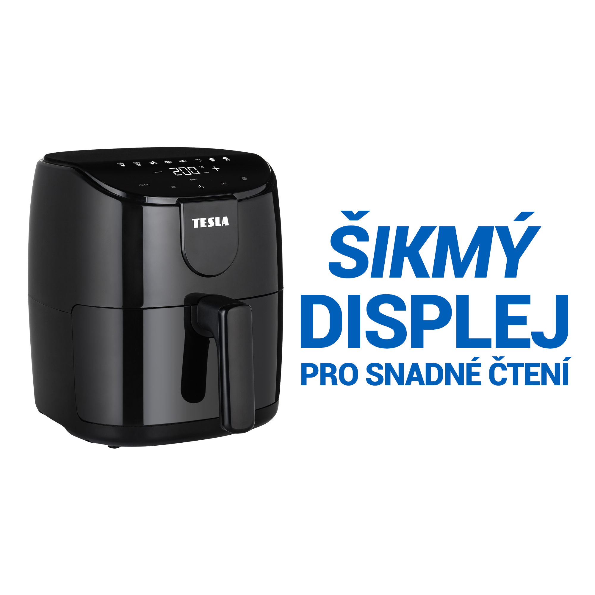 Na digitálním displeji, který je ergonomicky natočen směrem k vám pro snadnější čtení, si můžete ručně nastavit požadovaný čas a teplotu vaření nebo si vybrat z přednastavených programů jako jsou hranolky, maso, drůbež nebo ryba.