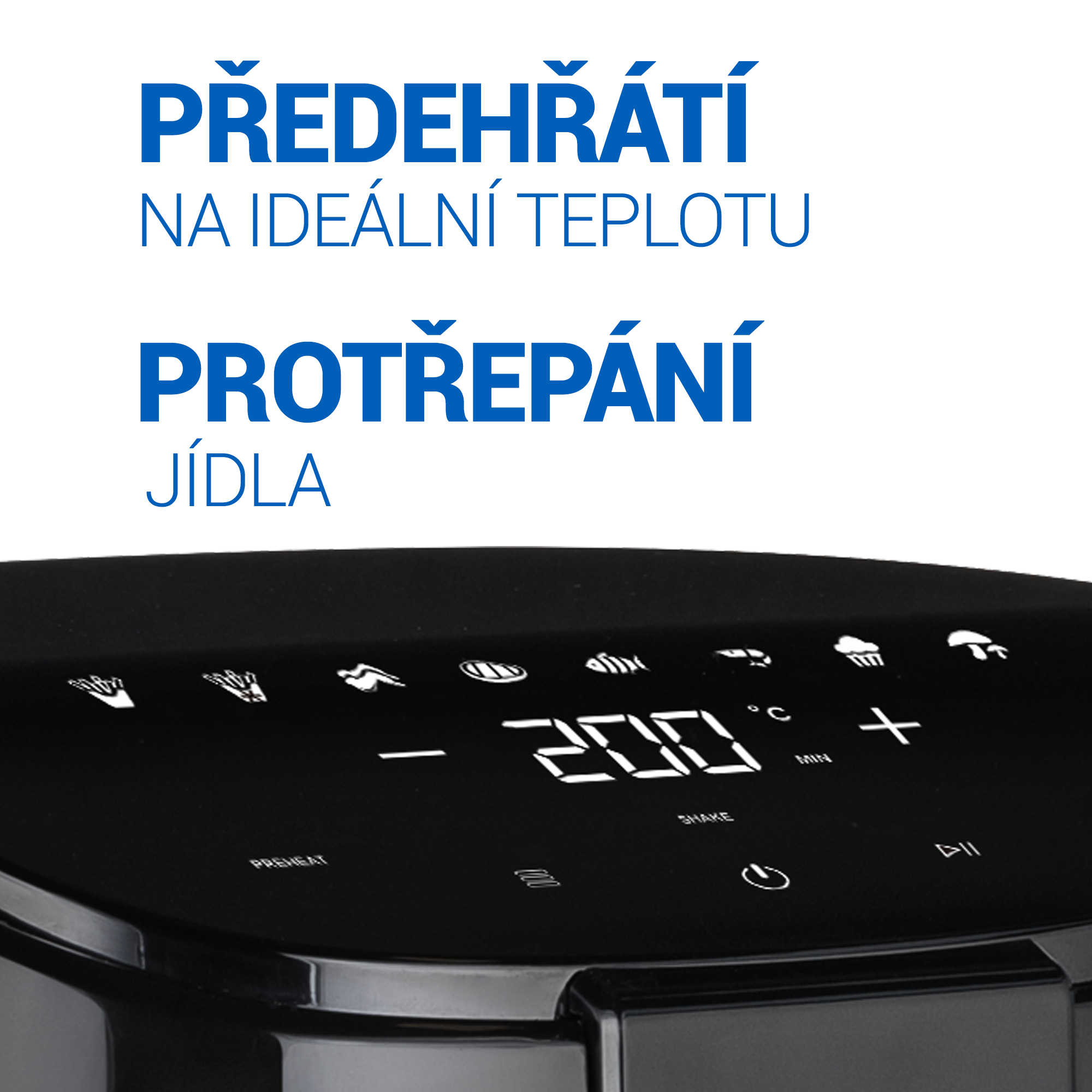 Pro nejlepší výsledek ohřevu použijte funkci Předehřátí, fritéza vás upozorní, když dosáhne ideální teploty pro vložení potravin určených k ohřevu. V polovině doby vaření se ozve zvukový signál, který vás upozorní na možnost Protřepání (promíchání) jídla pro co nejlepší propečení. Opatrně protřepejte nebo otočte potraviny pomocí kleští nebo obracečky.