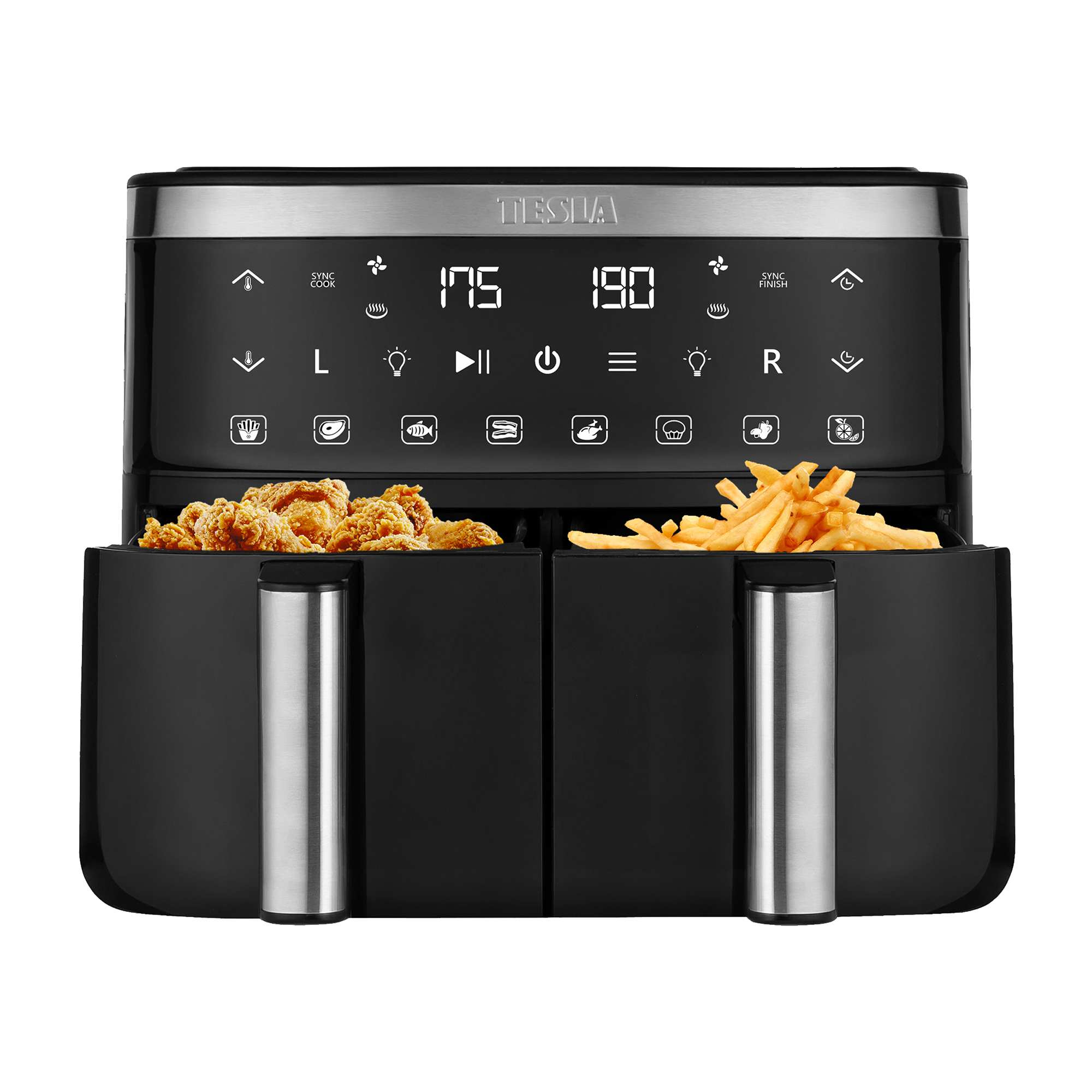 Funkce Sync Cook umožní vám ušetřit čas tím, že nastavíte současně stejnou Teplotu a Délku ohřevu pro oba dva koše současně. Funkce Sync Finish umožní nastavit různé programy na stejný čas ukončení. Potraviny v obou koších pak budou dokončeny ve stejný čas bez zbytečného čekání, to znamená, že nebudete například muset čekat s hranolky, až bude maso hotové (a naopak).
