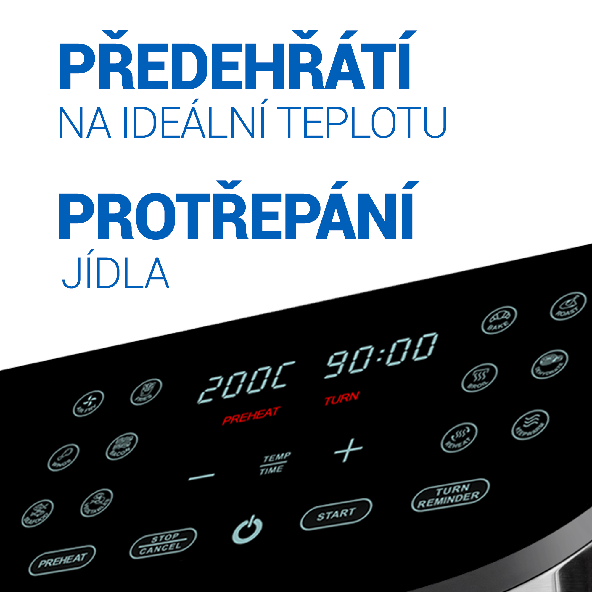 Na velkém LCD digitálním displeji můžete sledovat zbývající čas přípravy. Časovač umožňuje nastavení až 90 minut pro jeden cyklus ohřevu. Po dokončení cyklu se horkovzdušná fritéza automaticky vypne.
