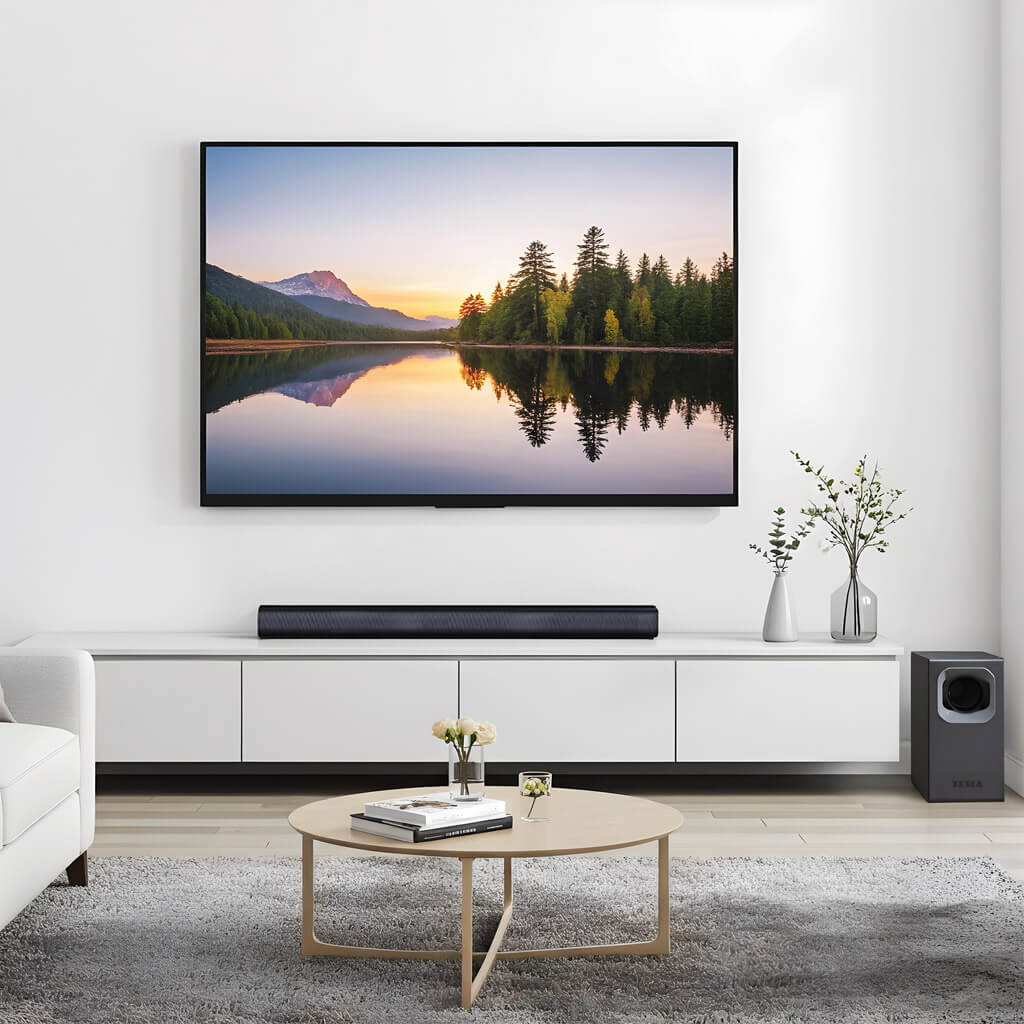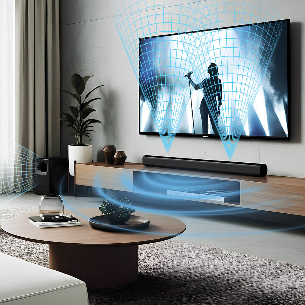 Soundbar poskytuje hluboké basy, které vám umožní cítit každý tón ve vaší oblíbené hudbě nebo filmu, s podporou bezdrátového subwooferu. Nejenže basy jsou bohatší a plnější, ale také výšky jsou křišťálově čisté a přesné, což zajišťuje ostrý a detailní zvukový zážitek. Tato kombinace výjimečných basů a ostrých výšek znamená, že vše od nejjemnějších tónů po nejsilnější beaty je reprodukováno s maximální čistotou a rozlišením, což vám umožní zcela se ponořit do zvukového prostředí.