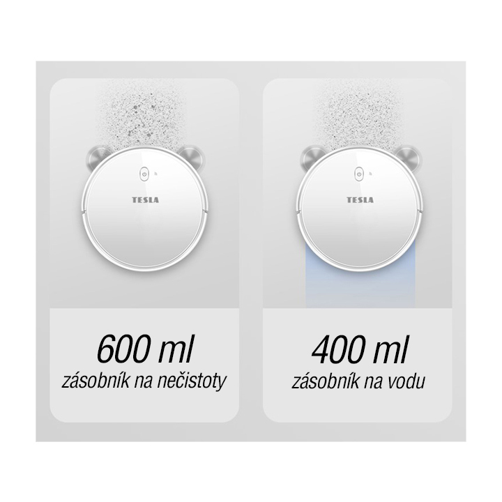 TESLA RoboStar iQ300 šetří váš čas. Dokáže totiž vysávat a vytírat mokrým mopem. K setření podlahy používá mokrý mop z mikrovlákna, který zanechá podlahu čistou, zbavenou mikroprachu a jiných nečistot. Zásobník na nečistoty s velkým objemem 600 ml pojme velké množství nečistot, a proto ho není potřeba tak často vyprazdňovat. Druhý zásobník na vodu s objemem 400 ml umožní stírání podlahy vodou.