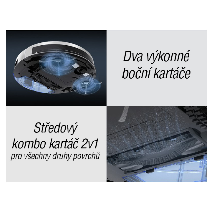 Dvojice antistatických štětinových bočních kartáčků namete nečistoty do čistící dráhy hlavního spirálového středového 2v1 turbo kombo kartáče, který si snadno poradí s nečistotami jak na podlaze, tak i na kobercích. TESLA RoboStar iQ300 uklidí také místa okolo nábytku, podél stěn, rohy místností a jiná těžko dostupná místa.