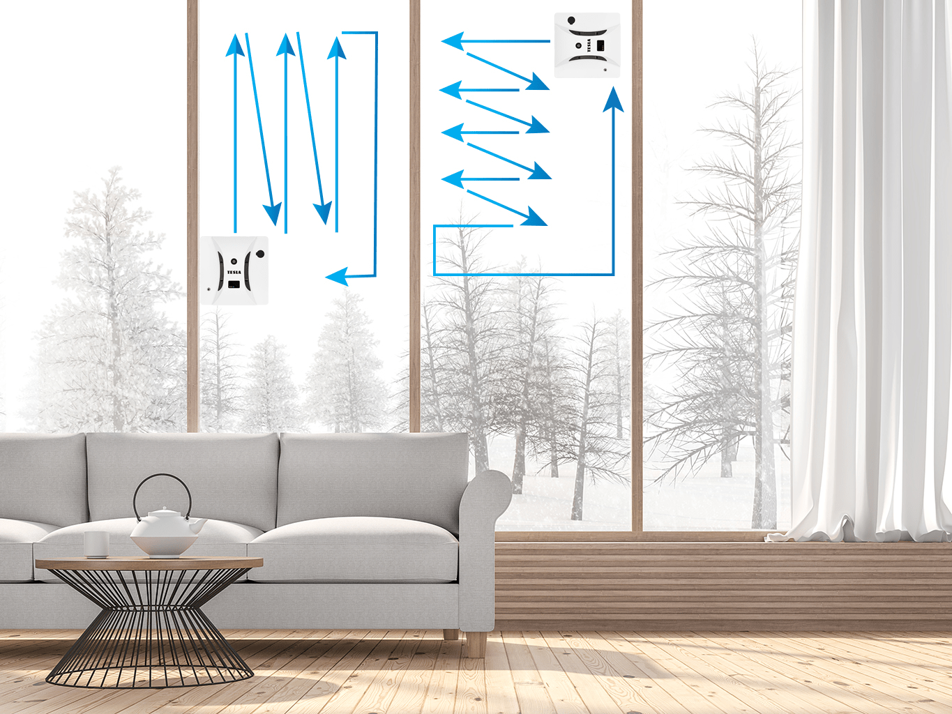 TESLA Robostar W600 se bezpečně pohybuje po čištěném povrchu, protože je vybaven senzory na spodní straně zařízení. S jejich pomocí může pracovat nejen na oknech s rámem, ale také na bezrámových oknech nebo jiných plochách, jako jsou zrcadla, sprchové kouty atd. o rozměrech větších než 50 x 50 cm.